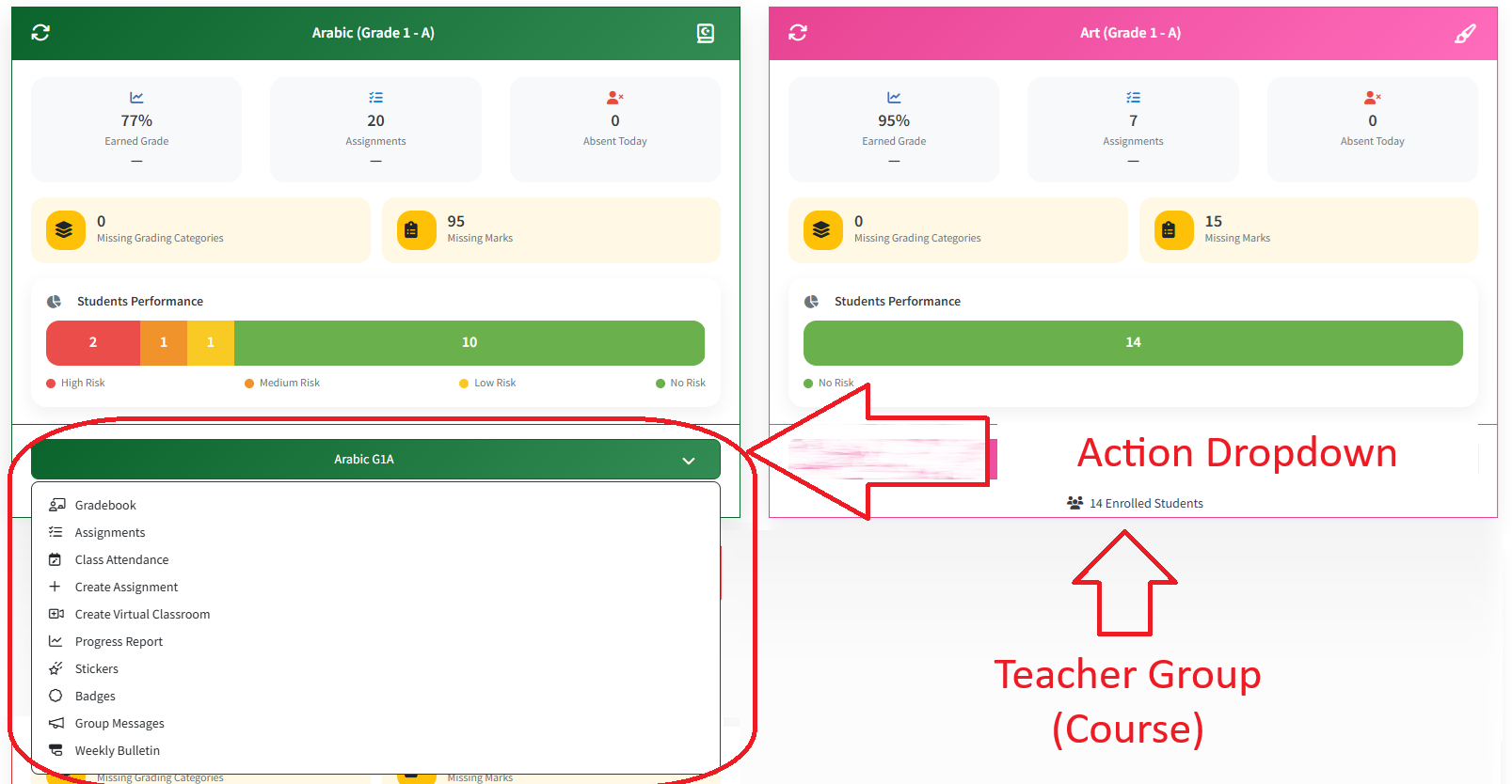 The Students Performance section visualizes classroom risk levels using a segmented performance bar. Each segment represents a group of students based on current performance indicators: